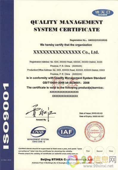 按照国际间经济合作和技术交流的惯例,合作双方必须在产品(包括服务)品质方面有共同的语言、统一的认识和共守的规范,方能进行合作与交流。ISO9000质量体系认证正好提供了这样的信任,有利于双方迅速达成协议9 9 信 息 网。